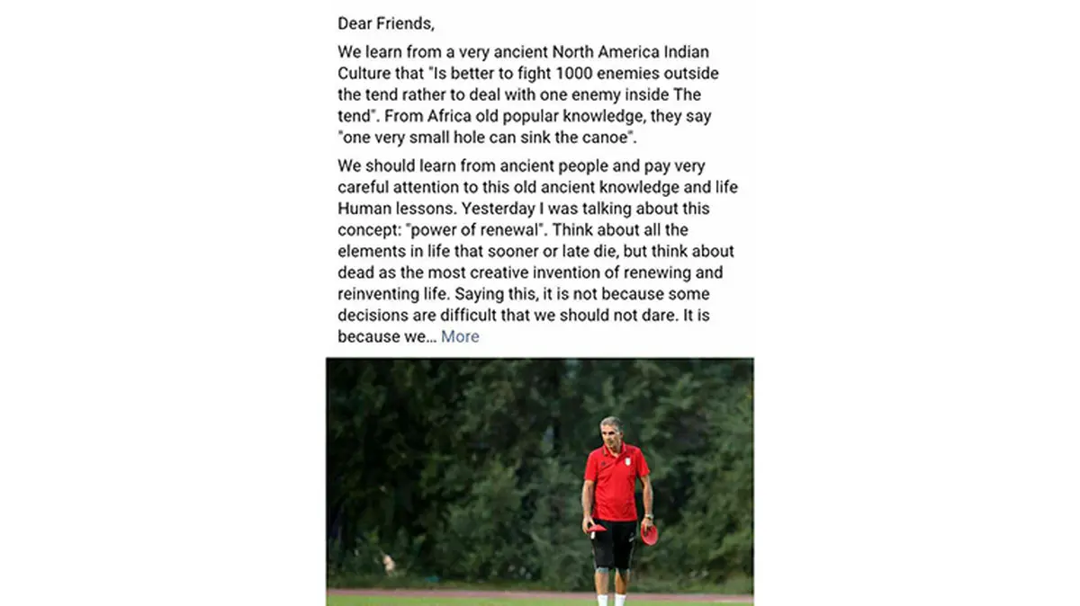 کارلوس کی روش سرمربی تیم ملی کشورمان ، پیامی جدید و جالب در فیس بوکش منتشر کرد. متن پیام را در ذیل مشاهده می فرمایید :