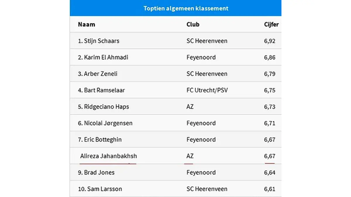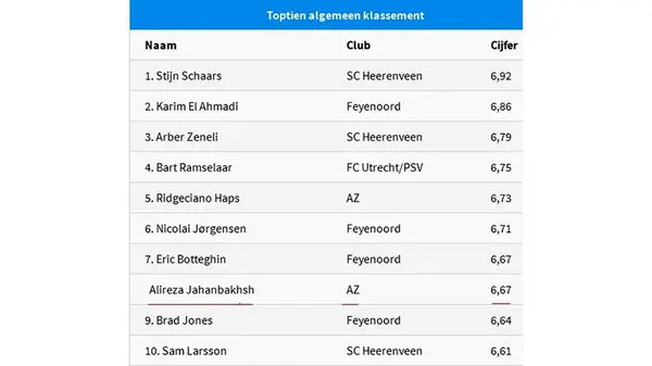 علیرضا جهانبخش ملی پوش ایرانی تیم آلکمار با امتیاز 6.67 در رتبه هشتم این رده بندی قرار گرفته است.برای ورود به کانال تلگرام ما کلیک کنید.