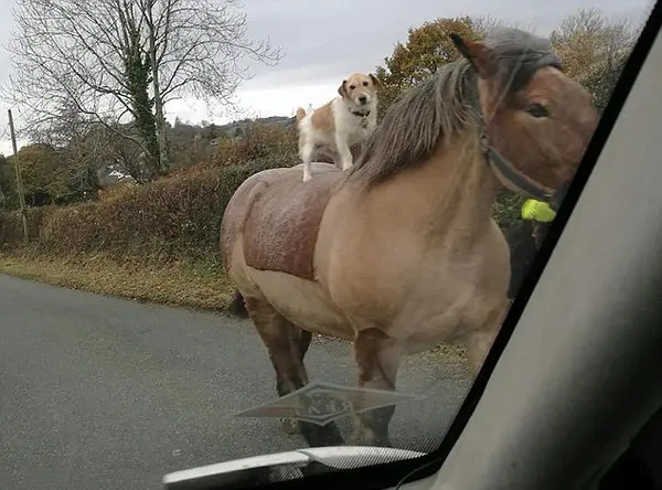 عکس های سوارکاری سگ سفید و قهوه ای منجر به شگفتی کاربران شده است. عکس های این شیرین کاری توسط سرنشینان خودرویی در جاده ای واقع در اکستر گرفته شده است. یکی از سرنشینان خودرو اذعان می دارد این سگ بقدری با اعتماد به نفس تعادل خود را روی اسب حفظ می کرد که گویی سالیان سال است که این ورزش را انجام می دهد. این سوارکار غیرمعمول خیلی جسور و نترس به نظر می رسید. جالب تر اینکه اسب نیز طوری سوارش را جابجا می کرد که انگار انسانی بر پشت اش نشسته است. عکاس این لحظه های ناب که "ریچارد وارد" بوده، مدعی است خود و دوستان اش به محض دیدن این صحنه به مدت 5 دقیقه هاج و واج مانده بودند. ریچارد 20 ساله همراه دوستان اش پنج شنبه گذشته شاهد این صحنه عجیب و غریب بودند. وی در کنار عکسی که در رسانه اجتماعی با کاربران به اشتراک گذاشته، نوشته است: "قطعا تا به حال سوارکاری سگی را ندیده اید بنابراین براتون عکس گرفتم." این عکاس عنوان کرد بعدا متوجه شدند این دو حیوان توسط زنی که سوار بر اسب دیگری بوده کنترل می شده اند.