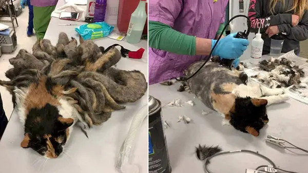 یکی از دامپزشکان کلینیک بیان کرد که موهای حیوان به حدی بلند شده که حرکت را برای جانور دشوار کرده و او برای تهیه غذا و قدم زدن دچار مشکل شده است . ما بلافاصله موهای زائد را از بدنش تراشیدیم و دارو و غذای لازم را به حیوان دادیم .