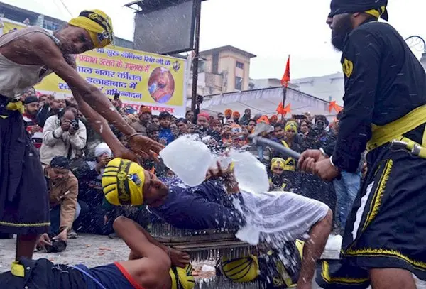 رکنا: اجرای مراسم سالگرد تولد " گورو گوبیند سینگ " در هند که با شکستن یخ بر شکم یکی از دوستداران وی برگزار می شود.