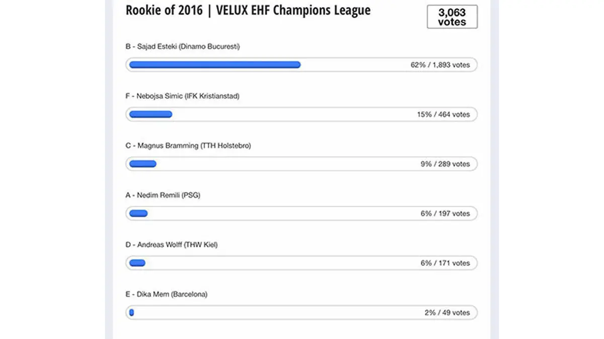 سجاد استکی، لژیونر هندبال دینامو بخارست و آقای گل لیگ قهرمانان اروپا با 62% رای مردم پدیده سال ٢٠١٦ هندبال اروپا شد تا اولین آسیایی باشد که این عنوان را کسب میکند.