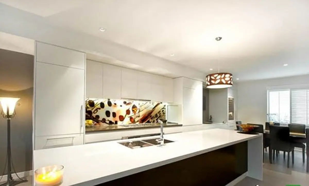 طراحی دیوارپوش آشپزخانه می تواند شامل عکس یا نقاشی های آبستره نیز باشد و یا طرح رنگی منحصر به فردی را به تصویر بکشد که هم با طراحی آشپزخانه و هم با ویژگی های شخصیتی صاحب خانه هماهنگ است. این تکنیک برای شیشه های رنگی و چاپ شده هم در دسترس قرار دارد که بسیار مقرون به صرفه است. در این تکنیک یک عکس یا الگوی خاص بر روی صفحه نازک آلومینیومی چاپ شده و بعد از آن روی آن پوشش داده می شود. این صفحه که بسیار سبک است با نوار چسب دو طرفه بر وی دیوار نصب می شود. به دلیل اینکه می توانید هر تصویری راکه دوست دارید را به سطح بیاورید، می توانید برای مثال طرحی از دیوار آجری با این روش را به جای دیوار آجری واقعی به کار ببرید.