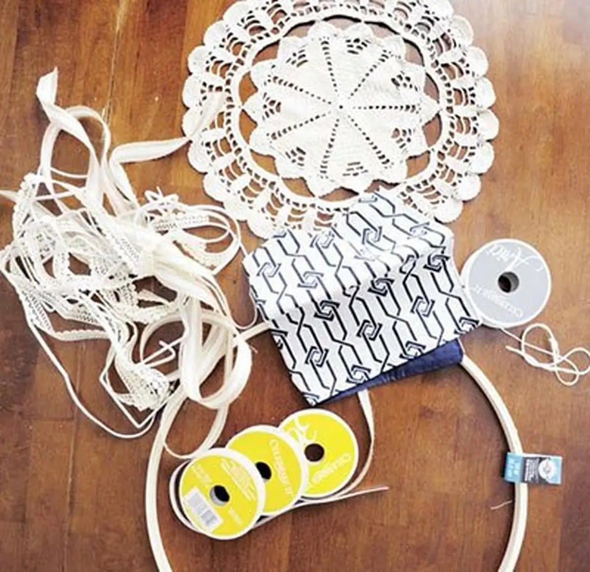 مرحله اول: نخ کلفت یا کاموایی که با رنگ اصلی دریم کچرتان هماهنگ است را از بین پارچه یا رومیزی انتخابی رد کرده و آن را به دور حلقه چوبی بپیچید.