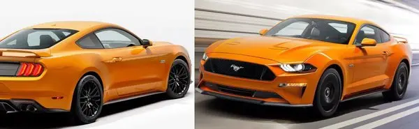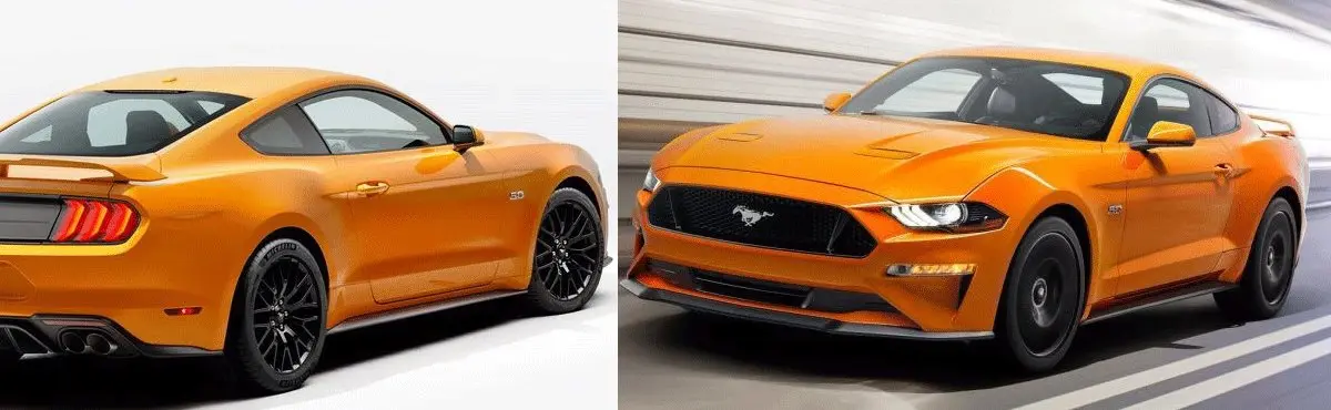 ظاهر موستانگ ۲۰۱۸ در مقایسه با نسخهی فعلی که در سال ۲۰۱۵ معرفی شد، علاوه بر کاهش ۲ سانتیمتری ارتفاع کاپوت جلو، در نمای روبرو و حالت چراغها نیز کاملا تغییر کرده و همراه با خطوط روی بدنه، چهرهای مدرن به خود گرفته است. جلوپنجره کوچکتر و ظریفتر شده است، چراغهای جلو تمام LED هستند و هرچند مانند مهشکنها، کوچکتر از مدل قبل شدهاند، روشنایی آنها کاملا بهبود یافته است. ملوین بتانکورت، طراح این خودرو، در نمای عقب تغییراتی متأثر از نسخهی ۲۰۱۶ موستانگ شلبی در این مدل جدید استفاده کرده است که در آن، چراغهای جدید LED و اگزوزهای ۲ جفت، داخل سپر جای داده شده است. دیگر تفاوت مهم موستانگ ۲۰۱۸ با نسل قبلی نیز در میان سپر عقب دیده میشود؛ جایی که چراغ نسبتا بزرگی برای هشدار ترمز اضافه شده است.
