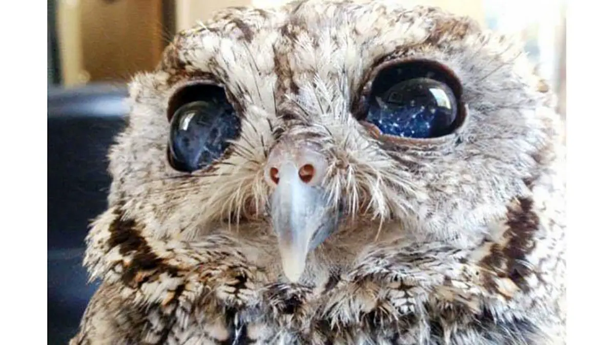 رکنا: زئوس، جغد نابینا که چشمانش مانند کهکشانها به نظر میرسند و احتمالا در نتیجهی حملهی یک شکارچی اینگونه شدهاند.
