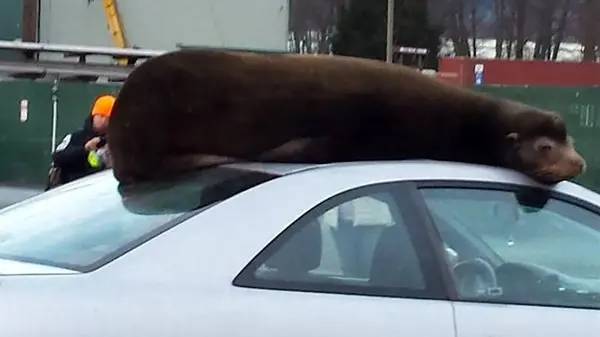حضور یک شیردریایی روی سقف یک اتومبیل در خیابان باعث تعجب و شگفتی عابران شد.