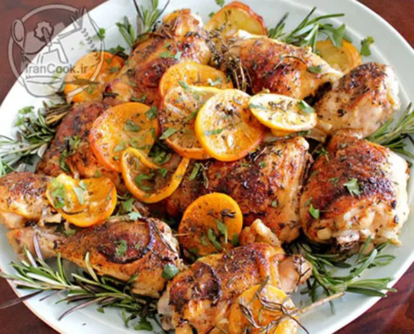 2-ادویه ایتالیایی، رزماری، آویشن، پودر پیاز و پاپریکا را روی مرغ ها بپاشید. پیاز را خرد کنید، لیمو و پرتقال باقیمانده را حلقه حلقه برش بزنید و لابلای تکه های مرغ قرار دهید.
