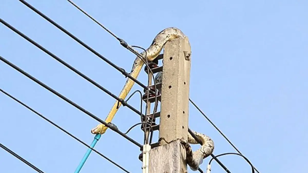 گیر کردن مار ۳ متری بالای تیر چراغ برق + تصاویر