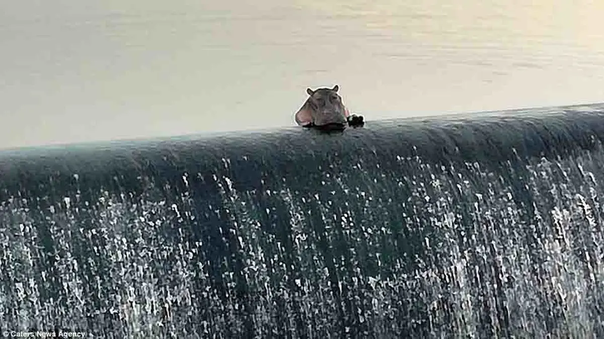 در این تصاویر مشخص شده است که یک اسب آبی خود را به لبه آبشار رودخانه رسانده و در حال تماشای محیط اطراف است.