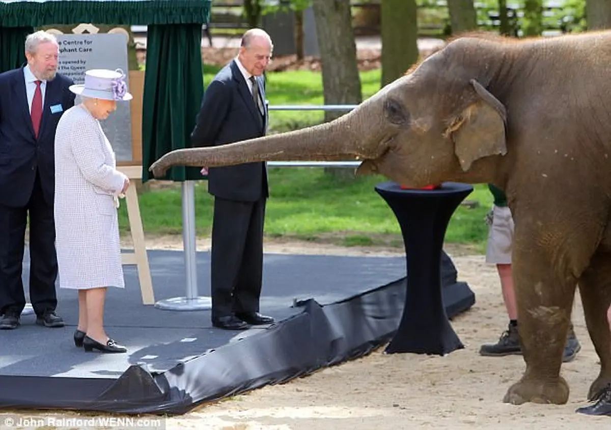 فیل که از دیدن ملکه و میوه خوردن بسیار خوشحال به نظر می رسد لبخند شیرینی در زمان ملاقات ملکه بر لب دارد.