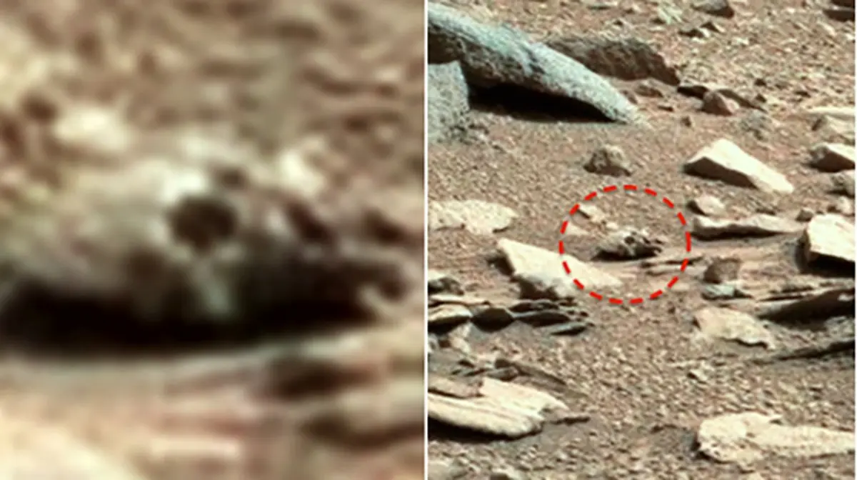 جستجوگران فرازمینی ها با استناد به عکسی که به تازگی توسط مریخ نورد ناسا تهیه شده است ادعای عجیبی را مطرح کرده اند. بنا به ادعای این محققان یک جمجمه متعلق به موجودات فضایی در این عکس دیده می شود. در قسمت بالای این جمجمه یا سنگ، دو حفره شبیه به حفره کاسه چشم انسان وجود دارد.