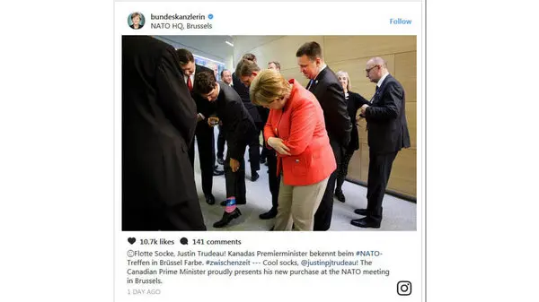 آنگلا مرکل، در صفحۀ اینستاگرامِ خود، عکسی از ترودو منتشر کرد که در آن، در حال پُز دادن به جوراب های دو رنگ خود است. یکی از جوراب های او صورتی و دیگری آبی بود.
