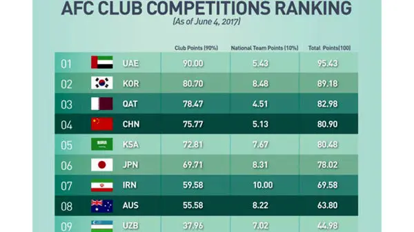 با توجه به جایگاه نه چندان مستحکم ایران در این رده بندی، سهمیه باشگاهی ایران در آسیا به 2+2 کاهش می یابد.