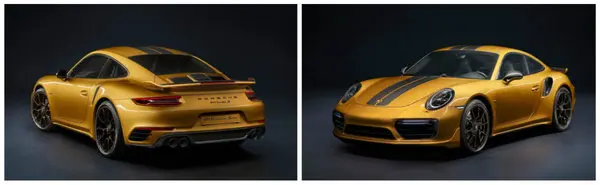 بدنه 911 Turbo S Exclusive Series به دلیل بهره گیری از رنگ منحصر به فرد زرد طلایی متالیک و استفاده از اجزای فیبرکربنی بسیار جلب توجه می کند. نوارهای مشکی موجود بر روی کاپوت و سقف نیز در هماهنگی کامل با این اجزا کنتراست و زیبایی بصری فوق العاده ای را خلق کرده اند.