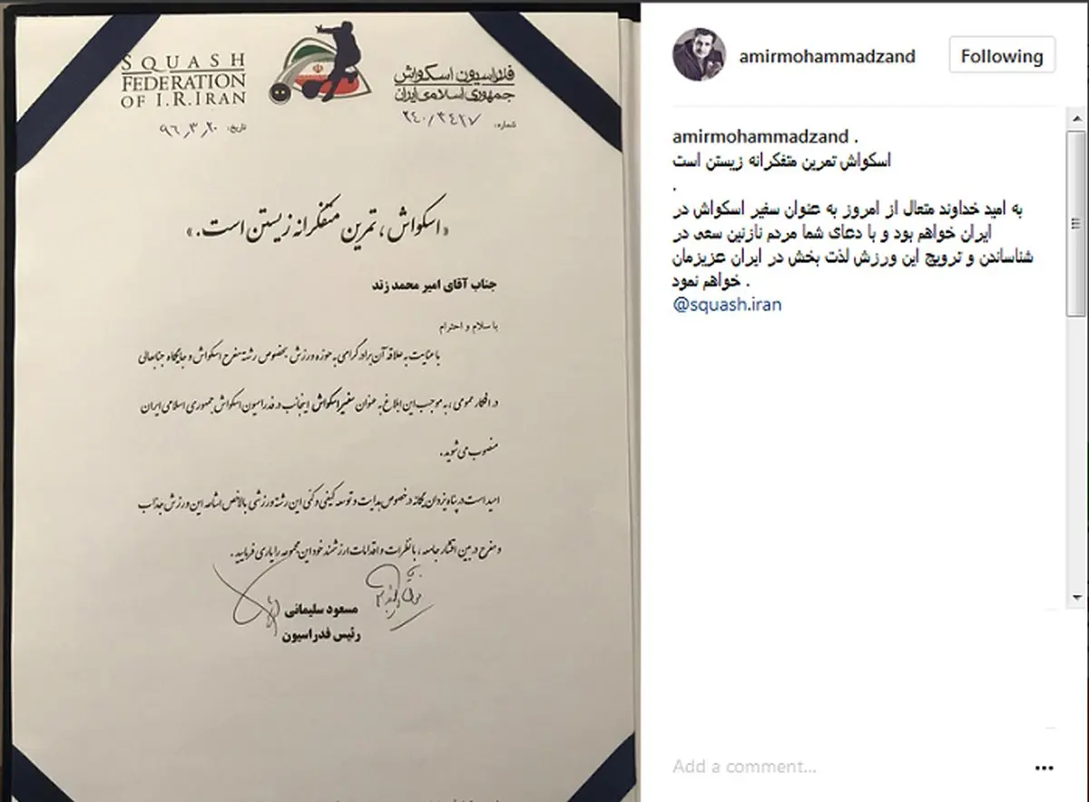 به امید خداوند متعال از امروز به عنوان سفیر اسکواش در ایران خواهم بود و با دعای شما مردم نازنین سعی در شناساندن و ترویج این ورزش Sport لذت بخش درایران عزیزمان خواهم کرد.برای ورود به کانال تلگرام ما کلیک کنید.