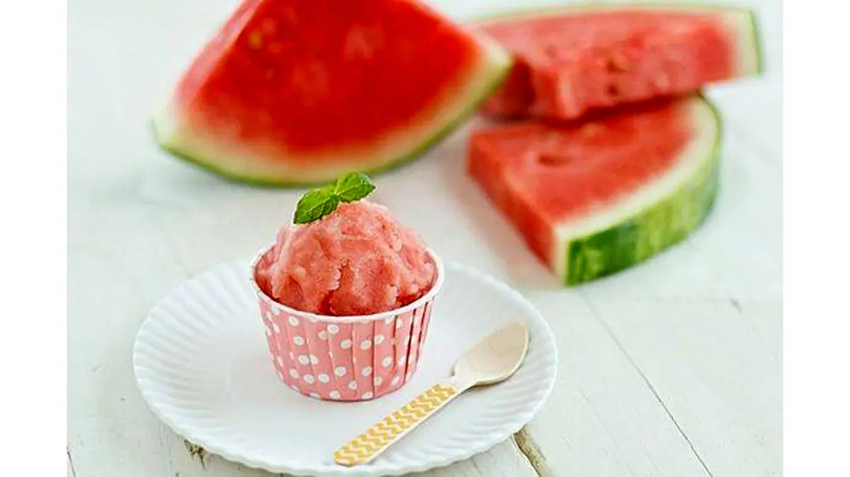 هندوانه را قاچ کنید و وسط هندوانه را بیرون بیاورید و در یک ظرف بریزید مواد دیگر را نیز به هندوانه اضافه کنید و داخل طرف دردار قرار دهید.هر یک ساعت یکبار مواد را با همزن برقی هم بزنید و دوباره در فریزر بگذارید. این کار را 4-5 بار انجام دهید و 20 تا 30 دقیقه قبل از خوردن آن را از فریزر بیرون بیاورید.برای ورود به کانال تلگرام ما کلیک کنید.