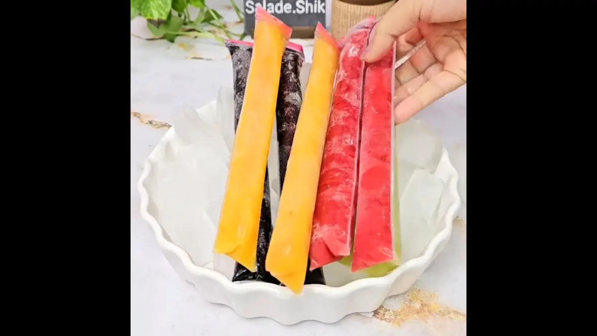 میوه های مورد نظر رو پوره کنید. روی پاکت زیپ کیپ رو اندازه بزنید. چاقو یا هر شیئی رو داغ کنید و روی پاکت خط بکشید تا جدا بشن. میوه های پوره شده رو به کمک قیف داخل زیپ کیپ ها بریزید. درشون رو ببندید و بذارین یخ بزنه.