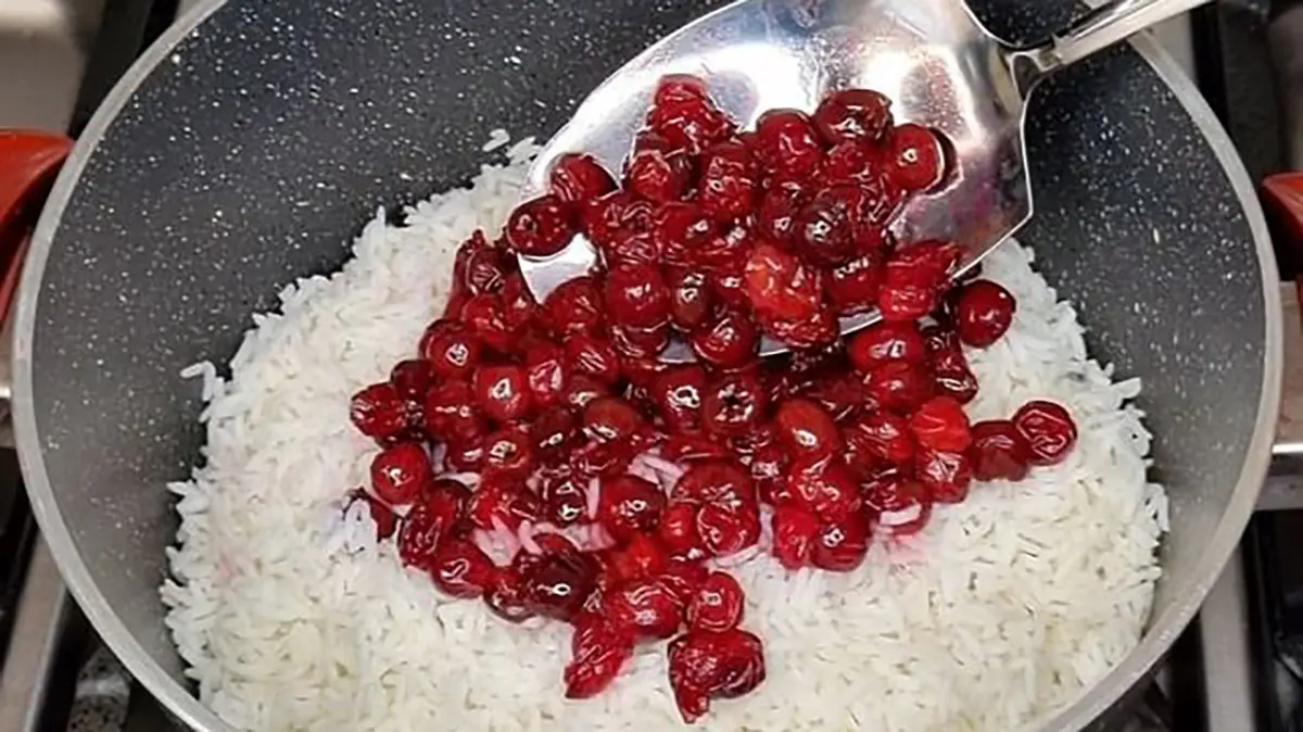 یک مقدار از برنج رو با زعفران و کمی هم با شربت آلبالو ترکیب میکنیم.