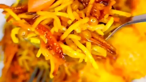 در این زمان پیازها رو خلالی خرد کرده با روغن سرخ میکنیم، نمک و زردچوبه اضافه میکنیم تا سرخ و رنگش طلایی بشه. بعد کشمش پلویی رو اضافه کرده زیر اجاق رو خاموش میکنیم.