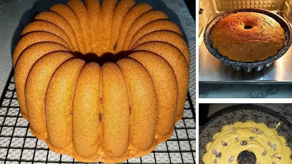 قالب را بگذارید در فر از قبل گرم شده با دمای اولیه 160 درجه سانتی گراد به مدت 25 دقیقه، سپس حرارت را بالا و پایین روشن کنید، درجه حرارت را تا 150 درجه سانتی گراد کم کنید تا کیک پخته شود (حدود 45 تا 50 دقیقه )، بستگی به دمای فر شما دارد؛ با خلال چوبی تست کنید. نوش جان