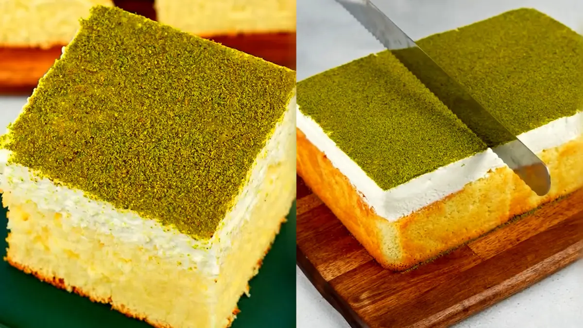 بریزید داخل قالب ۳۰ ×۴۰ یا میتونید مثل من داخل رینگ بریزید، برای درست کردن سس شیر خامه صبحانه رو با شیر کم کم هم میزنیم تا باز بشه. بعد شیر عسلی و وانیل اضافه میکنیم، بعد از اینکه کیک خنک شد یه لایه از روش برمیداریم تا روش صاف بشه. رینگ رو دوباره میذاریم دورش. سس شیر رو بهش اضافه میکنیم و بعد خامه قنادی فرم گرفته رو روی کیک میزنیم و یکدست میکنیم و روش با الک پودر پسته میریزیم. بعد رینگ رو جدا میکنیم و به دلخواه کیک رو برش میزنیم.