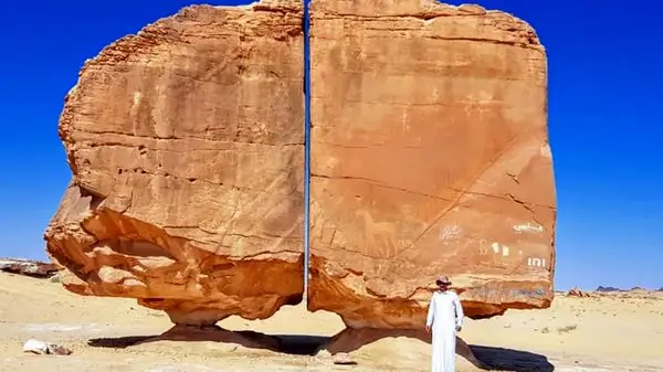 رکنا: صخره النصله در عربستان سعودی، سازهای ماسه سنگی با 2 نیمه متقارن و شکافی مرموز است اما دانشمندان تا امروز راز شکل گیری این صخره را کشف نکرده اند.