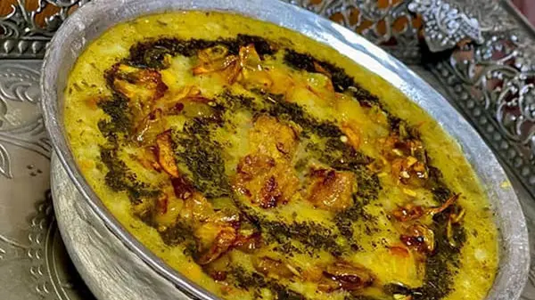 تزیین و سرو: آش برنج را در ظرف مورد نظر ریخته و با پیاز داغ، سیر داغ و نعنا داغ تزیین کنید.