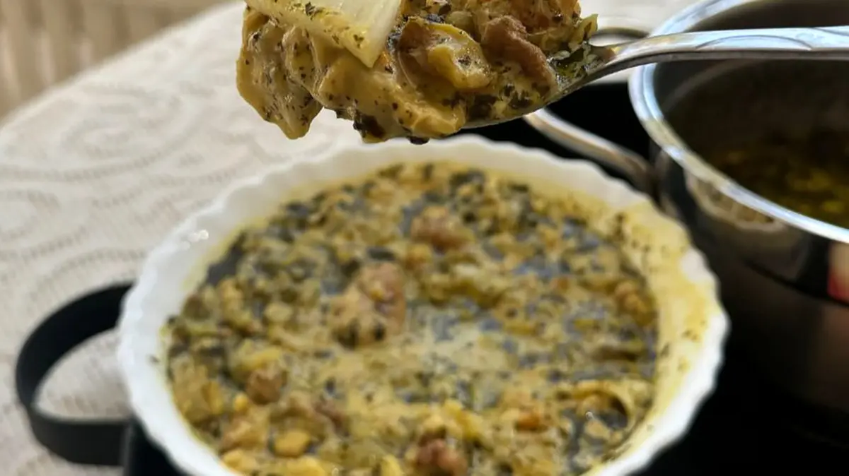 اول پیاز رو با روغن تفت می دیم. بعد بهش زردچوبه می زنیم و سیر رنده شده. بعد هم گردوی خرد شده و زردآلوی خشک و نعناع خشک رو اضافه می کنیم. همه رو با هم تفت می دیم. بعد هم کشک و ماست و آب رو اضافه می کنیم و می ذاریم ریز بجوشه و بپزه. بعد هم با پیاز و نون خشک سرو می کنید. این غذا اینقدر خوشمزه است که از خوردنش سیر نمی شید.