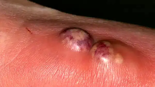 ممکن است بر اثر اصطکاک یا سوختگی ایجاد شود و به راحتی با لمس و فشار میترکد.