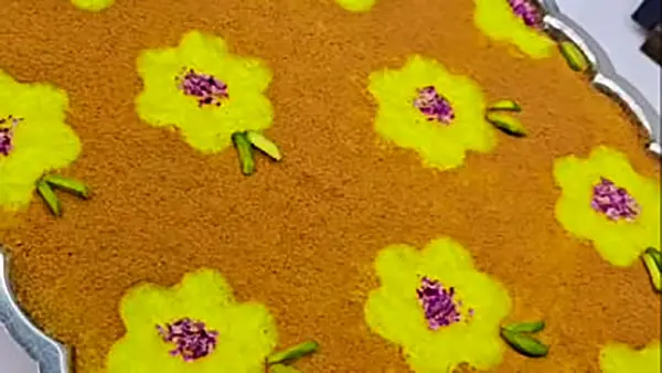 شله زرد رو توی ظرف سروتون بکشید و اجازه بدین که خنک بشه و رویه ببنده و به کاغذ نچسبه. روی کاغذ طرح مورد نظرتون رو بکشین و روی شله زرد قرار بدین. حالا دارچین رو الک کنید و بعد به آرومی کاغذها رو بردارین. وسط گل ها پودر گل محمدی بریزید و برای برگ از خلال پسته استفاده کنید.