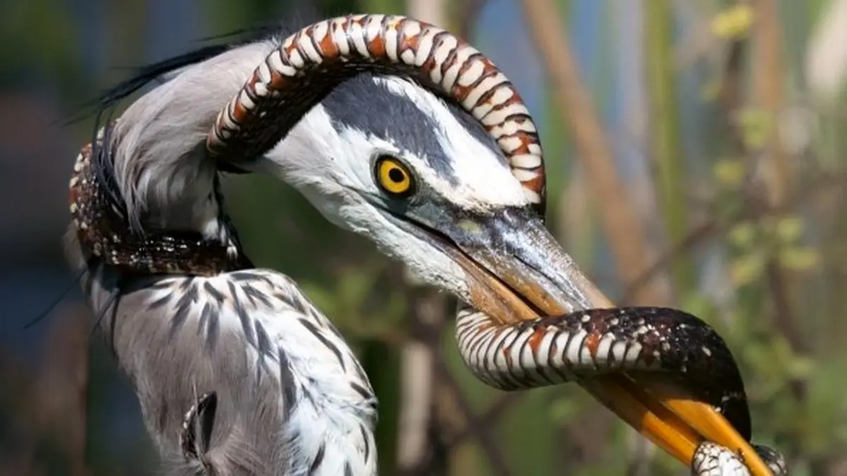 حواصیل آبی و شکار مار؛ داستان جالب یک تصویر + فیلم