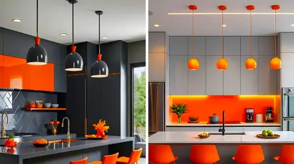 در طراحیهای مدرن، ترکیب رنگ نارنجی با خاکستری یا مشکی یک راهکار جذاب و جسورانه محسوب میشود. این ترکیب حالتی شیک و خاص ایجاد میکند. در مقابل، اگر به سبک سنتی علاقهمندید، بهتر است نارنجی را با چوب طبیعی و کاشیهای کلاسیک به کار بگیرید. همچنین، استفاده از چراغهای آویز با شیشههای نارنجی رنگ، جزئیاتی خاص و توجهبرانگیز به فضا اضافه میکند.