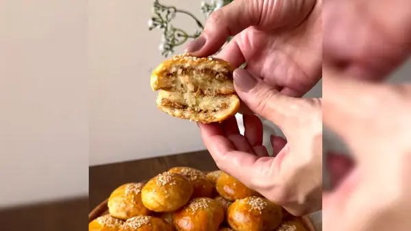پهن کنید و از مواد میانی داخل خمیر رو پر کنید و بعد خمیر رو بغچه کنید و بذارید داخل سینی فر.