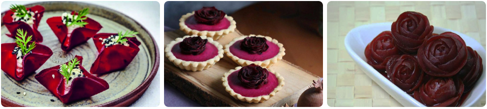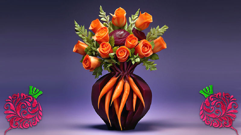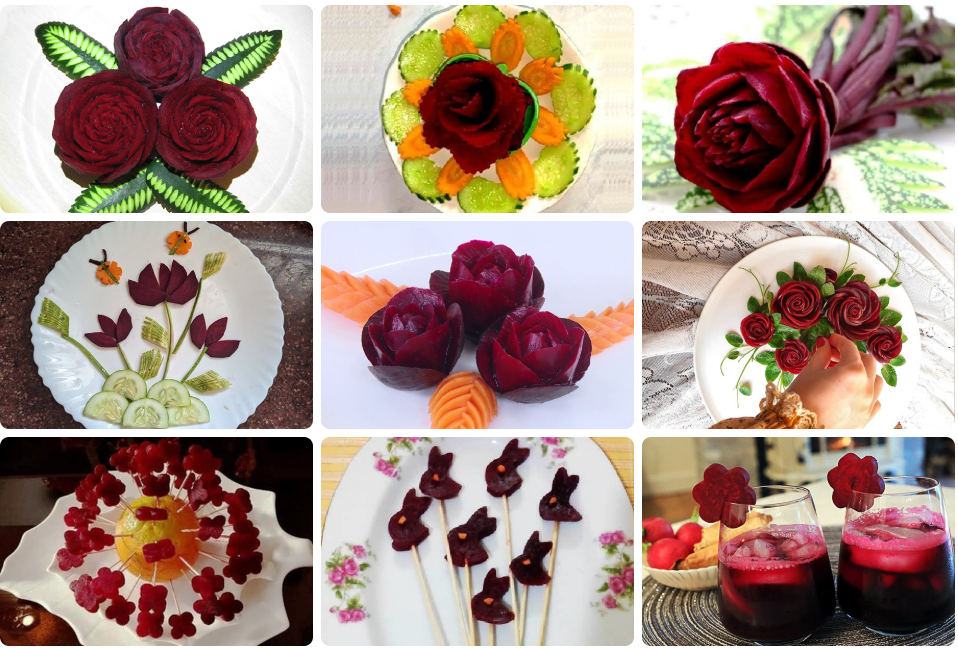 گلهای لبو: تکههای لبو را به شکل گلبرگ برش داده و با سیخ چوبی به هم متصل کنید تا گلهای زیبایی ایجاد شود.
