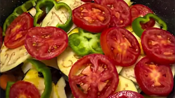 پیاز → مرغ → سیبزمینی و بادمجون و فلفل دلمهای → آخر سر گوجههای خوشرنگ