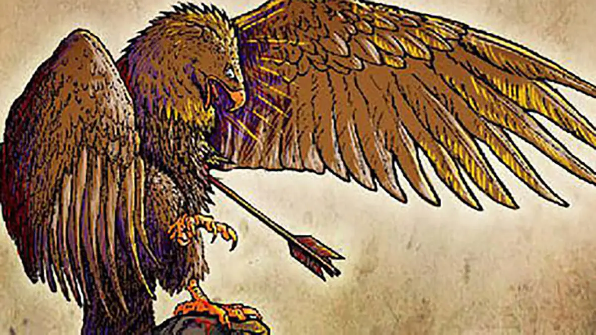 آنگاه نگاهی به تیر کرد که در بال اش فرو رفته بود؛ تیری که از پر عقاب ساخته شده بود! پس سرافکنده گفت: نمی توان کسی دیگری را سرزنش کرد زیرا هر اتفاقی که برای من افتاد ریشه اش به خودم بر می گردد و به خاطر غرور و خود خواهی ام این بلا بر سرم آمد.