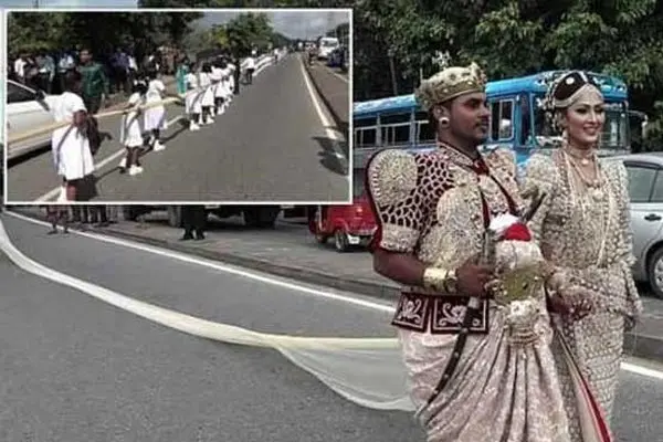 زن و شوهر سریلانکایی برای حمل دنباله بلند لباس عروس از ۲۵۰ دانش آموز استفاده کردند.