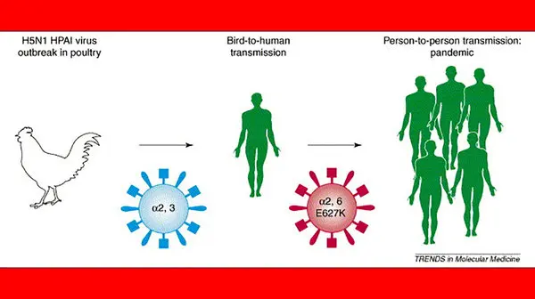 ب) آنفلوانزای مرغی می تواند به فرم تطابق یافته با انسانها تبدیل شود که این واقعه در همه گیری آنفلوانزا در سال ۱۹۱۸ رخ داده است . شواهدی وجود دارد که ویروس آنفلوانزای مرغی H۵N۱ این روند را شروع کرده است ولی دانشمندان بر این عقیده اند که هنوز مسیر زیادی طی نشده است