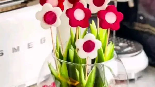 به گزارش رکنا، شب یلدا می توانید با استفاده از برش زدن قالبی شلغم خام و چغندر مطابق فیلم به شکل گل و قرار دادن هر برش در یک خلال چوبی بلند و سپس کنار هم چیدن کل این گل های سبزیجاتی در یک گلدان شیشه ای یک گلدان خوراکی و سالم با میوه جات زمستانی داشته باشید.