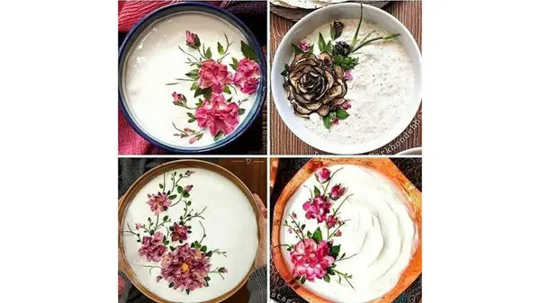 نعنا و گل محمدی را پودر کنید و این تزیینات زیبا را روی ماست با گذاشتن قالب گل ایجاد کنید.