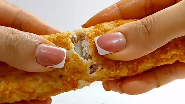 با چاقو سینه مرغ را چرخ کن و بعد با نمک و فلفل سیاه مخلوطش کن و پنیرت را بگذار داخلش تا شکل سوسیس شود. بعد هم اول بزن در تخم مرغ و بعد پودر پارمزان.
