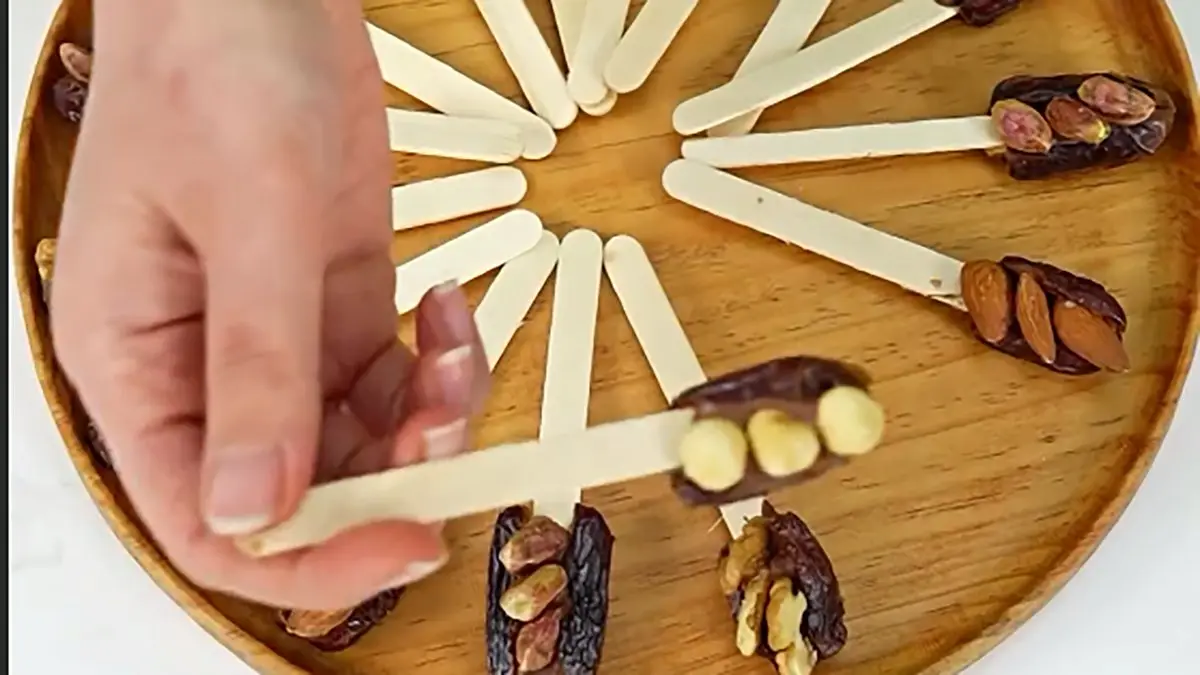 هسته خرماها را در می آوریم و داخلش کمی کره بادام زمینی می زنیم. بعد چوب بستنی را می زنیم در شکلات و می گذاریم داخل خرما؛ دوست داشتید باز شکلات بزنید. بعد هم رویش را مغز دلخواه بگذارید.