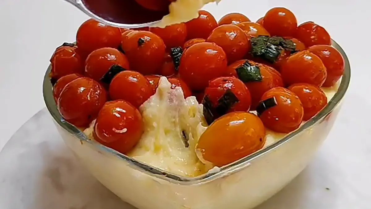 گوجه گیلاسی یا گوجه قاچ شده، برگ سیر یا پیازچه، پنیر خامه ای 2 قاشق غذاخوری، ماست 2 قاشق غذاخوری، سیبزمینی یک عدد، تخم مرغ 2 عدد، آبلیمو، نمک و فلفل سیاه، روغن زیتون که من فراموش کردم فیلمش را بگذارم روی سیب زمینی و تخم مرغ می ریزیم. رویش می توانید گردو هم بپاشید.