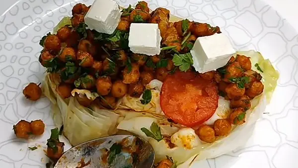 املت نخود و پنیر را بریزید روی کلم و با جعفری تازه و پنیر صبحانه سرو کنید.