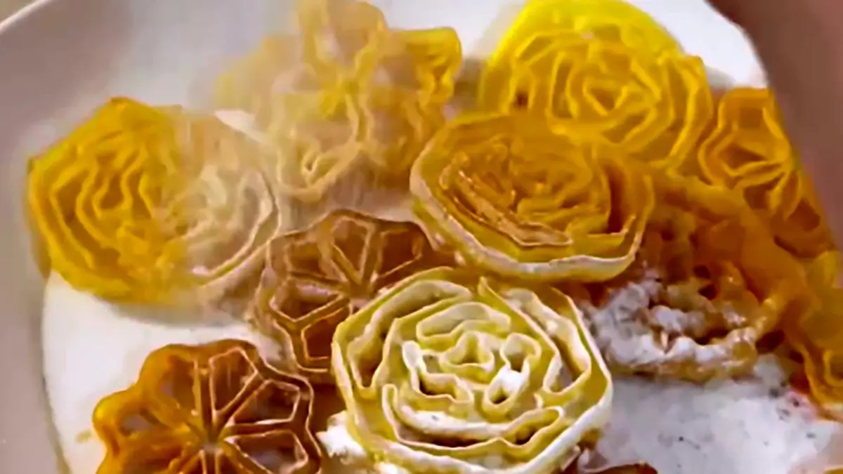 قالب را کامل در مواد فرو نکنید؛ تا جایی که لبه های قالب عین فیلم آغشته به مواد شود کافی است. بعد در روغن داغ بگذارید. چند ثانیه صبر کنید. حالا قالب را یک تکان بدهید. راحت جدا می شود و سریع برگردانید آن سمت و همان لحظه خارج کنید تا شیرینی نسوزد.