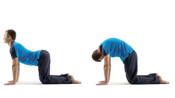 برای ورود به این حالت، روی دست ها و زانوها شروع کنید. دست های شما باید به عرض شانه از هم فاصله داشته باشند و زانوها باید زیر باسن شما باشند. نفس عمیق بکشید و سر خود را به سمت سقف خم کنید و در عین حال لگن خود را بالا ببرید. این باید شبیه یک "گاو" باشد. بعد با نفس کشیدن، پشتت را خم کن و سر و لگن را مثل یک گربه پایین بیاور. شما می توانید این دو حرکت را چند بار قبل از حرکت تکرار کنید.