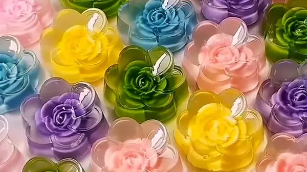 برای گل های رز وسط اول نصف هر بسته ژله را با نصف یک لیوان آب جوش رقیق کنید. کامل که حل شد بگذارید خنک شود. بعد نصف پیمانه کمتر شیر را به آن اضافه و مخلوط کنید. حالا قالب را چرب کنید. ژله را بریزید داخلش و بگذارید یخچال تا کامل ببندد. تمامی ژله های رنگی را به این صورت انجام بدهید.