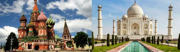 تاج محل بنایی است مسجد مانند با گنبدی سفید که در سال های 1632 تا 1653 به دست شاه جهان یکی از امپراتوریهای مغول ساخته شد. گنبد فوق العاده زیبا و عظیم تاج محل نقطهی عطف این بنا است و شهرتی جهانی دارد. این گنبد در حدود 35 متر ارتفاع دارد و در قسمت بالایی شبیه به یک نیلوفر آبی طراحی شده. این بنا در حال حاضر از معروفترین سازهها در دنیا است و هر روزه توسط انواع تور مسافرتی و تور یک روزه مورد بازدید قرار میگیرد.
