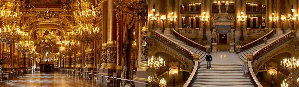 روی دیوارهای داخلی کاخ گارنیه در پاریس، نقاشی های قابل توجه و متفاوتی به چشم می خورد که باعث رازآلود شدن بیشتر این کاخ شده است. یکی دیگر از شاخصه هایی که باعث باشکوه تر شدن کاخ گارنیه در پاریس شده است، وجود پله های بزرگ و پهن است، این پله ها، شما را به سمت آمفی تئاتر هدایت می کنند.